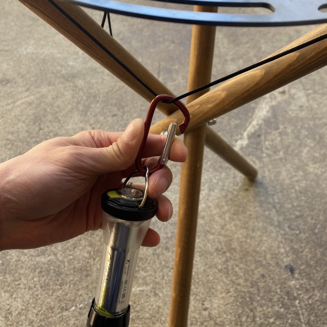 三脚先端部に付いている紐にゴールゼロ社 Lighthouse Micro Flashをカラビナなどで引掛け、上向きに照らす事により簡単にサジェクションを楽しむ事も可能です(サジェクションとは影遊びの事です)